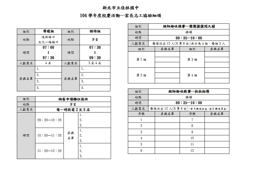 1. 以下為校慶活動當日需煩請各家長志工協助之處,若各志工時間方便,歡迎大家踴躍報名參加。